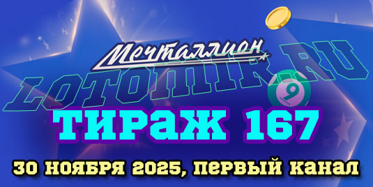 Представляем вашему вниманию результаты 167 тиража национальной лотереи Мечталлион, который состоялся 30 ноября 2025 года. Также у нас вы можете проверить лотерейный билет онлайн разными способами - по числам, по номеру билета, по QR коду на билете.