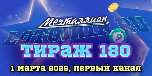 Представляем вашему вниманию результаты 180 тиража национальной лотереи Мечталлион, который состоялся 1 марта 2026 года. Также у нас вы можете проверить лотерейный билет онлайн разными способами - по числам, по номеру билета, по QR коду на билете.