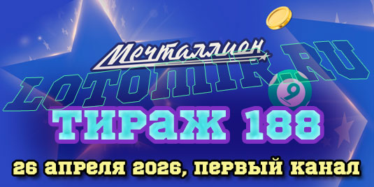 Представляем вашему вниманию результаты 188 тиража национальной лотереи Мечталлион, который состоялся 26 апреля 2026 года. Также у нас вы можете проверить лотерейный билет онлайн разными способами - по числам, по номеру билета, по QR коду на билете.