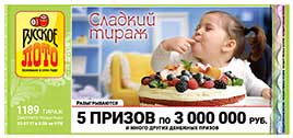 Русское лото в лице ведущих сделает миллионерами в 1189 тираже пятерых счастливчиков. Будет разыграно пять крупных денежных призов по 3 миллиона рублей. Такая сумма может обеспечить сладкую жизнь на протяжении некоторого времени даже самым требовательным игрокам. Например, можно купить просторную квартиру или роскошную машину бизнес-класса. Вот такой он, Сладкий 1189 тираж Русского лото!
