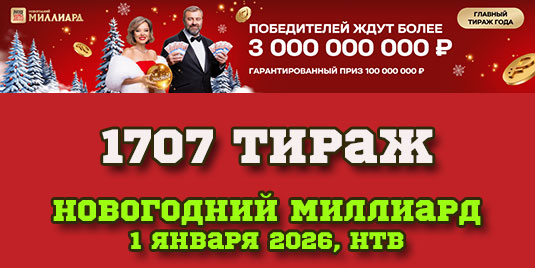Представляем вашему вниманию результаты новогоднего 1707 тиража Русское Лото, который состоялся 1 января 2026 года и где разыгрывались многочисленные денежные призы, в том числе самый главный приз года - 1 миллиард рублей. Также у нас вы можете проверить билет новогоднего миллиарда онлайн разными способами - по числам, по номеру билета, по QR коду на билете.
