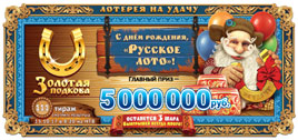 Наверняка многие игроки уже слышали, что на этой неделе лотерея Русское лото отмечает свой 23-й День рождения. Для участников розыгрыша ведущий Михаил Борисов приготовил несколько приятных сюрпризов, ну а поскольку Русское лото уже давно стало символом всех российских лотерей, то праздник отмечается повсеместно, и Домовой из Золотой подковы с удовольствием разыгрывает в 111 тираже большой денежный приз в сумме 5 миллионов рублей. Пусть эти деньги выиграет самый удачливый игрок!