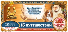 В 194 тираже Домовой откроет копилку Золотой подковы - ещё несколько участников с самыми несчастливыми билетами, где есть все три невыпавших числа, выиграют дополнительный денежный приз. Для этого все три невыпавших номера должны располагаться в одном и том же игровом поле билета - в верхнем или в нижнем. Розыгрыш копилки состоится в самом конце, когда в лототроне останутся три шарика. Примета 194 тиража Золотой подковы гласит, что нужно подружиться с соседской собакой. Если пёс будет к вам ластиться, значит, скоро вам поступят очень приятные известия. Ждите новостей и играйте в Золотую подкову - билет стоит всего 100 рублей!