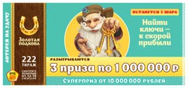 Если вы заждались возможности выиграть в Золотой подкове приличную сумму денег – то вот он, ваш шанс! В 222 тираже организаторы обозначили три крупных денежных выигрыша, каждый по 1 миллиону рублей. Для разогрева в первом туре ведущие разыграют 100 тысяч, ну а затем будут определены наши новоиспечённые миллионеры. Однако, девиз Золотой подковы гласит, что в этой игре выигрывают чаще, а тремя призами вряд ли можно обрадовать добрых несколько сотен участников. Поэтому, как и обычно, розыгрыш пройдёт до тех пор, пока в лототроне не останется всего три шара – и тур за туром игроки будут получать небольшие денежные суммы. В среднем выиграет третья часть всех проданных на 222 тираж билетов.