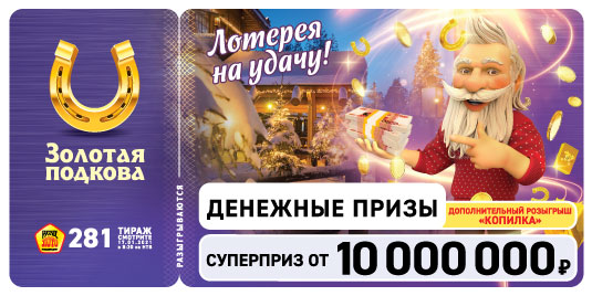 Уважаемые участники розыгрыша 281 тиража лотереи Золотая подкова! Добро пожаловать к нам на сайт. Здесь вы можете ознакомиться с официальными результатами розыгрыша, посмотреть запись видео тиража в отличном качестве и проверить ваши билеты разными способами. Например, любой игрок сможет проверить билет Золотой подковы на 281 тираж по его номеру - это будет возможно прямо в день розыгрыша (воскресенье, 17 января 2021 года), после 10:20 часов по Москве. Прочие способы (по числам, по видео, по таблице) доступны уже с раннего утра.